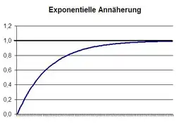 - exponentieller Annäherung, bei der sich eine Größe einem vorgegebenen festen Wert annähert. Der praktisch wichtigste Spezialfall hiervon ist der exponentielle Zerfall (Abbau), bei dem eine Größe sich monoton abnehmend immer langsamer der Null nähert, aber nie erreicht.