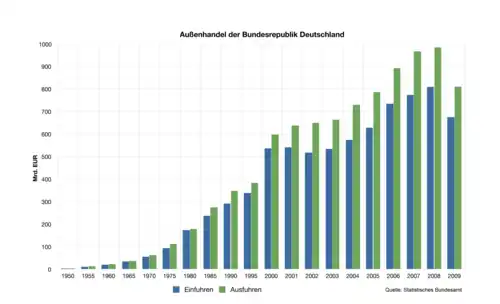 In der Abbildung sind für die Triadenländer, also die drei größten Volkswirtschaften der Welt, die Exporte im Verhältnis zum jeweiligen Bruttoinlandsprodukt (BIP) dargestellt, außerdem der Nettoexport im Verhältnis zum BIP. Steigende Exportquoten deuten auf eine zunehmend arbeitsteilige Weltwirtschaft hin, die Handelsverflechtung der Welt nimmt zu (Globalisierung). Insbesondere in Deutschland wird unter den Schlagworten Exportweltmeister und Basarökonomie eine intensive Debatte um die Bedeutung der deutschen Exportzuwächse geführt.