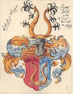 - Blasonierung des Stammwappens von 1466: Von Rot und Blau gespalten, darüber ein goldener Büffelskalp mit Ohren und Hörnern. Auf dem Helm mit blau-goldenen Helmdecken der goldene Büffelskalp mit Ohren und Hörnern, letztere jeweils außen an zwei Stellen und an der Spitzer mit einem schwarzen Hahnenfederbusch besteckt.