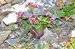 Die Blüten sind vereinigt zu paarweise vorliegenden, endständigen Köpfchen. Zur Fruchtzeit sind die Blütenstiele aufgeblasen. Der Fruchtknoten ist unterständig. Der Kelch ist ein ringförmiger, sich nicht vergrößernder Wulst. Die Blütenkrone ist purpurn und 8 bis 16 Millimeter lang. Ihre Röhre ist etwas bauchig, gebogen und bis zu 4 Millimeter lang. Die fünf Zipfel sind rosa gefleckt, flach und ungleich. Meist sind zwei Staubblätter vorhanden.