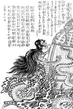 Die Frau nutzt das wilde Tanzen der anderen Gäste, um die große Glocke herunterzulassen und sich unter ihr zu verstecken. Als der führende Priester davon hört, erzählt er den Anwesenden eine Geschichte: Vor langer Zeit dachte die Tochter eines Herzogs von Manago, von einem Priester des Tempels betrogen worden zu sein. Sie verwandelte sich in eine giftige Schlange, jagte den Priester und tötete ihn, als er sich unter der Glocke versteckte, indem sie Feuer auf die Glocke abließ.
