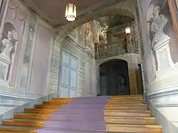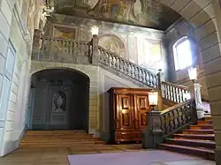 Im Inneren der ehemaligen Fürstbischöflichen Residenz wurde das repräsentative Haupttreppenhaus – der so genannte Prunkaufgang – vom Direktor der Reichstädtischen Kunstakademie Johann Georg Bergmüller im Jahr 1752 freskiert. Die Bemalung zeigt in an den Seitenwänden u. a. Allegorien der drei Hauptflüsse des Hochstifts Augsburg – Danubius (Donau), Lycus (Lech) und Vinda (Wertach). Zwischen Wappenkartuschen und Zeichnungen des Bauherrn befinden sich in vier Eckspiegeln Darstellungen der platonischen Kardinaltugenden: Prudentia (Klugheit), Justitia (Gerechtigkeit), Fortitudo (Tapferkeit) und Temperantia (Mäßigung). Über allem wacht an der Decke die „Providentia Divina“, die göttliche Vorsehung.