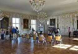 Ein kleiner mit Putten verzierter Vorraum führt in den Rokokosaal, das im Stile des Rokoko gehaltene ehemalige Tafelzimmer aus der Regierungszeit Bischof Josephs von Hessen-Darmstadt. Die dort in die Wandverkleidung integrierten acht Ölgemälde zeigen zeitgenössische fürstliche Personen, u. a. das damalige Kaiserpaar Franz I. und Maria Theresia. An der Stelle des Festsaales befand sich im Vorgängerbau der Raum des Augsburger Domkapitels, in dem am 25. Juni 1530 die Confessio Augustana, das „Augsburger Bekenntnis“ der lutherischen Protestanten, verkündet worden war.