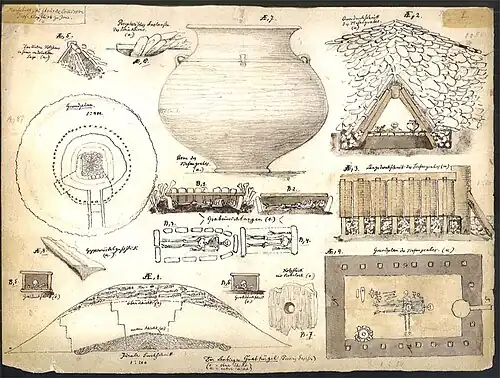 Zunächst wurden im oberen Bereich der bronzezeitlichen Hügelschüttung siebzig menschliche Skelette gefunden. Bestattungssitte und Schmuckbeigaben lassen diese slawischen Gräber in die Zeit zwischen 700 und 1000 n. Chr. datieren. Solche Nachbestattungen in älteren Hügelschüttungen sind nicht ungewöhnlich. Auf Bodenniveau stießen die Ausgräber auf eine unversehrte, zeltförmige Totenhütte aus Eichenholz, die in die Aunjetitzer Kultur (2200–1600 v. Chr.) datiert wurde.