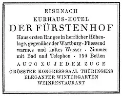 1854 entstand mit dem Sommerhaus des Fleischermeisters Samuel Liebetrau der Ursprungsbau des späteren Hotelkomplexes. Dieses Haus wurde 1861 von dem Geologen und Bergbauunternehmer Johann Georg Bornemann erworben und schrittweise durch Anbauten ergänzt.[2] So entstand die „Villa Bornemann“, die nach dem Tod von Bornemann (1896) verkauft wurde. Nach Umbau und Erweiterung durch die Architekten Georg Unruh und Lorenz Freitag wurde in dem Gebäude am 15. Mai 1902 das „Kurhaus Hotel Fürstenhof“ eröffnet. Der große Festsaal bot zu diesem Zeitpunkt bereits für 1800 Personen Platz und galt als größter Veranstaltungssaal in Thüringen. Die bürgerliche Oberschicht in Eisenach war bestrebt, den Ort nach dem Vorbild von Baden-Baden in eine mondäne Kurstadt zu verwandeln. 1903 wurde an der Waisenstraße den Hang aufnehmend eine Kurhausterrasse mit Garagen im Erdgeschoss und einem weiteren Grottensaal im Zwischengeschoss errichtet. Aus dem Kurhaus entstand nach Aufgabe der Kurstadtpläne durch weitere An- und Umbauten das „Hotel Fürstenhof“, das durch den schrittweisen Ausbau ein eklektizistisches Erscheinungsbild erhielt. Markant waren mehrere Zwiebeltürme auf dem Gebäude, die heute größtenteils nicht mehr erhalten sind. Auf den Grundmauern der Kurhausterrasse wurde in den 1920er Jahren ein Casino errichtet.