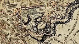 ![]() Kupferstich von Tölz von Matthäus Merian (1644): Schloss rechts im Bild | ||