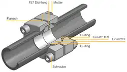 In das aufgeweitete Rohrende wird dann ein Einsatz (Insert) aus Stahl, bzw. Edelstahl eingesetzt, dessen Geometrie zum trichterförmigen Rohrende passend ist. Dieser Einsatz hat einen O-Ring an der trichterförmigen Seite, um sich dichtend an die Rohrwand zu drücken. Des Weiteren ist der Einsatz an der Stirnseite mit einer Nut versehen, in die ein Profildichtring „F37 Seal“ aus z. B. Polyurethan eingefügt ist. Alternativ ist eine Ausführung des Einsatzes mit einer flachen Stirnseite oder auch einer Verbunddichtung aus Stahl, bzw. Edelstahl mit Elastomerdichtlippe aus NBR oder FKM möglich. Für eine Rohr-zu-Rohr-Verbindung besteht eine Sonderform des Einsatzes, welche über beidseitig trichterförmige Konturen mit O-Ring-Abdichtung verfügt.