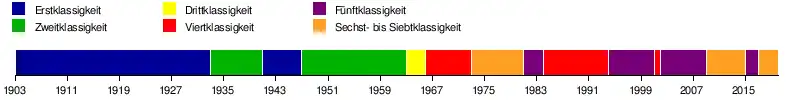 Übersicht über die Spielklassenebene, auf der der FC Kilia seit seiner Gründung agierte