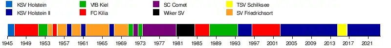 Weiterhin sorgten auch die Stadtduelle gegen andere Kieler Vereine für besonders hohe Zuschauerzahlen und mitunter äußerst umkämpfte Duelle, in denen es hauptsächlich um die Rolle als stadtinterne Nummer zwei ging. Da diese Position in der Landeshauptstadt im Verlauf der Jahrzehnte unter mehreren verschiedenen Vereinen umstritten war, bildete sich jedoch keine Rivalität mehr aus, die unter diesen Stadtderbys zeitlich überdauernd hervorstechen sollte. Hinter Holstein Kiel und – seit 2009 – der Zweitvertretung der KSV ist Kilia mit vierzehn Spielzeiten in den Top zwei der zweiterfolgreichste Kieler Fußballverein vor dem SV Friedrichsort (dreizehn Saisons) und dem VfB Kiel (zehn Spielzeiten). Seit dem sportlichen Abstieg des FC Kilia werden zwar auch weitere Aufeinandertreffen innerhalb der Landeshauptstadt als Stadtderby bezeichnet,[27] die jedoch im Hinblick auf die sportliche Bedeutung und das Zuschauerinteresse nicht mehr von vergleichbarer Relevanz sind wie in den vorangegangenen Jahrzehnten.