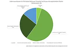 Verglichen mit anderen FFH-Gebieten ist der Anteil der kartierten Lebensraumtypen nach Anhang I FFH-Richtlinie mit knapp 23 % gering, siehe auch Diagramm 3. Folgende Lebensraumtypen wurden der EU-Umweltbehörde laut Standard-Datenbogen im Mai 2019 gemeldet:[10][11]
