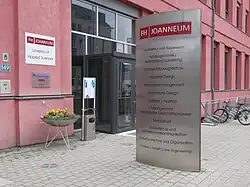 Die FH Joanneum (Eigenschreibweise in Versalien FH JOANNEUM) ist eine Fachhochschule mit drei Standorten Graz, Kapfenberg und Bad Gleichenberg in der Steiermark. Sie hat rund 5000 Studierende, rund 750 Mitarbeiterinnen und Mitarbeiter und 1180 Lehrbeauftragte.[5] Sie bietet Studiengänge mit wirtschaftswissenschaftlichem, technischem, gesundheitswissenschaftlichem und sozialwissenschaftlichem Schwerpunkt.
