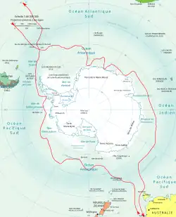 1819 wurde er mit der Leitung der vom russischen Zaren Alexander I. initiierten ersten russischen Expedition in die Südpolarregion beauftragt.[3] Als Kapitän der von Benjamin Stuckey gebauten Sloop Wostok (935 t) brach er zusammen mit dem Versorgungsschiff Mirny (530 t, Konstrukteur: Iwan Kurepanow, Kapitän: Michail Lasarew) im August in Kronstadt auf. Auf der Hinreise wurde die Inselnatur der Südlichen Sandwichinseln erkannt, die James Cook für Gebiete einer größeren Landmasse gehalten hatte.[4] In den 751 Tagen der Reise entdeckte die Expedition 29 neue Inseln im Pazifik und Atlantik. Den Ruf, Entdecker der Antarktis zu sein, erlangte Bellingshausen, weil er am 28. Januar 1820 erstmals den Rand eines „Eis-Kontinents“ sichtete. Bellingshausen hatte das Schelfeis beschrieben, das als Teil des antarktischen Kontinents betrachtet werden kann.[5] Im Verlauf der eigentlichen Unternehmung wurde sechsmal der südliche Polarkreis überquert und die Antarktis umsegelt. Es war nach den Forschungsreisen James Cooks die zweite Expedition, die so weit nach Süden vorstieß. Im August 1820 wurde der 70. Breitengrad erreicht und dabei das antarktische Festland auf einem südlicheren Kurs als durch Cooks Expedition umsegelt.