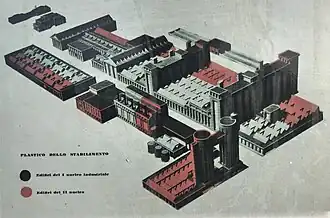 Die Fabrik setzt sich aus mehreren Gebäuden zusammen, die unterschiedlichen Zwecken dienten und sich daher je nach Funktion in Form und Volumen unterscheiden. Den Besucher empfangen gleich im Eingangsbereich zwei 1938 von Leone Lodi geschaffene Statuen, deren eine die Landwirtschaft, die andere die Industrie symbolisiert, was die doppelte Funktion der Planstadt mit ihrem Anbau und der Verarbeitung von Pfahlrohr unterstreichen sollte.