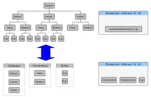 Im nebenstehenden Beispiel sind zwei Varianten von Klassifikationssystemen skizziert, die einen Ausschnitt aus dem Themenbereich „Schuhhandel“ darstellen könnten. Die obere stellt dabei einen monohierarchischen Katalog dar, bei dem eine Präkombination vorgenommen wird. Bei der unteren Variante handelt es sich um eine Facettenklassifikation. Rechts davon wird dargestellt, wie dasselbe konkretes Objekt – ein Budapester, ein Herrenschuhmodell, in Größe 49 – in beiden Systemen klassifiziert würde. Im präkombinierten System würde dieses Objekt nur der Klasse „Herrenstraßenschuh in Übergröße“ zugeordnet. In einer Facettenklassifikation wären es dagegen deren drei, und zwar „Herrenschuh“, „Straßenschuh“ und „Übergröße“.