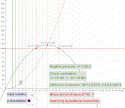 Die Schnittpunkte von Parabeln der Form mit der Parallelen zur -Achse liefern somit Teilerkandidaten. Das Verschieben der Parabel liefert entweder die nicht-trivialen oder, im allerletzten Schritt, die trivialen Teiler einer Zahl.