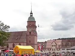 Falko Traber auf dem Hochseil, 2016 über dem Marktplatz in Freudenstadt