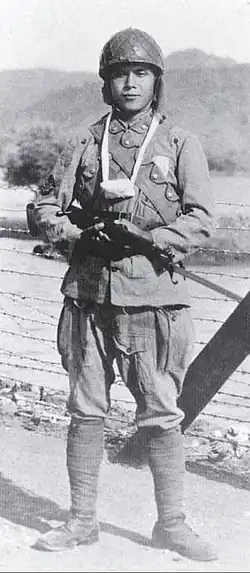 Marine-Fallschirmjäger trugen eine spezielle zweiteilige olivgrüne Fallschirmschützen-Bluse , die aus 50 % Baumwollen und 50 % Seide bestand.[14] Die hüftlänge Jacke wurde in zwei verschiedenen Versionen geliefert, die unterschiedlich angebrachte Taschen hatten. Voluminöse Taschen waren an der Hose vorne und seitlich angebracht, einige davon mit unterteilten Fächern. Als Kopfbedeckung wurde eine leichte Feldmütze mit Kinnriemen gestellt, die über einen Nacken-Sonnenschutz verfügte. Über der Feldmütze wurde der Stahlhelm aufgesetzt, der eine dunkle, olivegrüne Farbe hatte.[14] Der Helm verfügte über eigene Kinnriemen, die über die Kinnriemen der Feldmütze getragen wurden. Als Fußbekleidung wurden braune knöchelhohe Lederstiefel sowie braune Lederhandschuhe getragen.