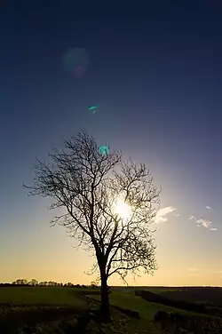 Ähnliche Effekte entstehen durch Streulicht im optischen Medium zwischen Objekt und Kamera, typischerweise durch Rayleigh-Streuung des Lichts in der Atmosphäre.[2] Bei der Aufnahme von weit entfernten Motiven wird deren Bild vom Streulicht der dazwischen liegenden Luft überlagert. Der Effekt wird durch zusätzliche Partikel in der Luft (Dunst) noch verstärkt. Im Ergebnis wird der Kontrast vermindert, und auch die Farbwiedergabe ändert sich, denn kleinere Wellenlängen werden von der Atmosphäre stärker gestreut, so dass das überlagernde Streulicht bläulich ist.