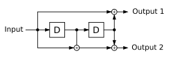Ein Faltungscodierer kann als endlicher Automat mittels Zustandsübergangsdiagramm interpretiert werden, wie er in nebenstehender Abbildung für zwei Speicher mit vier Zuständen abgebildet ist. Die Anzahl der Zustände ergibt sich allgemein bei binärem Code aus der Anzahl z der Zustandsspeicher zu 2z.