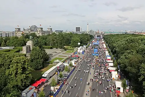 Zur Fußball-Europameisterschaft in Polen und der Ukraine (8. Juni bis 1. Juli 2012) richtete Berlin Deutschlands größtes Fußball-Fanfest vor allem bekannt unter „Fanmeile“ auf der Straße des 17. Juni aus.[9]
