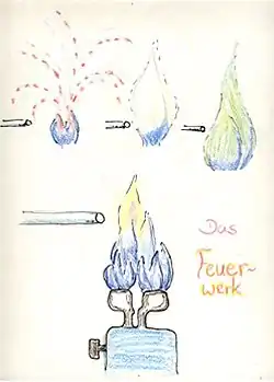 Nacheinander werden Späne aus Aluminium, Eisen, Magnesium und Kupfer in eine Bunsenbrennerflamme geblasen. Alu leuchtet weißgelb, Eisen rötlich gelb, Magnesium weiß in Sternchen und Kupfer grün. Bläst man hingegen Ruß ein, so leuchtet der Brenner in den warmen Farben einer Kerze. Offenbar ist es brennender Ruß, der unsere Kerze leuchten lässt. Indes verschwindet der Ruß bei ungestörter Verbrennung wieder, ist also wohl nur ein Zwischenprodukt der Verbrennung. Er entsteht aus Wachsdampf, aber wo geht er hin?