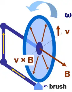 Tatsächlich ist aber das Magnetfeld des Dauermagneten von seiner Rotation (weitgehend) unabhängig. Es macht daher keinen Unterschied, ob er rotiert oder nicht. Hingegen wirkt (für einen ruhenden Beobachter) auf die Elektronen in der Scheibe die Lorentzkraft, sobald sie im Magnetfeld bewegt werden. Daher wird zwischen den ruhenden Schleifkontakten genau dann eine Spannung gemessen, wenn sich die Scheibe dreht[1].