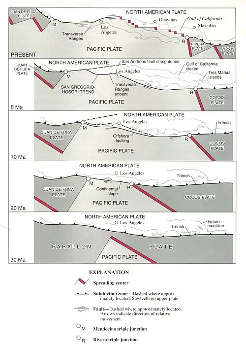 - ↑ Tanya Atwater, Joann Stock: Pacific-North America Plate Tectonics of the Neogene Southwestern United States: an Update. S. 393–421 in: Wallace G. Ernst, Clemens A. Nelson (Hrsg.): Integrated Earth and Environmental Evolution of the Southwestern United States. Bellwether Publishing, Columbia (MD) 1998, ISBN 0-9665869-0-5, S. 409.