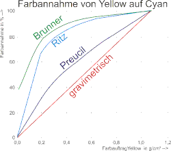 In der Praxis ist diese Methode auf Grund ihrer Einfachheit am gebräuchlichsten. Die Formel nach Preucil geht von dem Modell aus, dass die Farbschichten planparallele Platten sind. Sie gibt die Ergebnisse einer gravimetrischen Bestimmung der Farbannahme an Labordrucken am besten wieder.