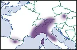 Die Vorkommen sind isoliert und räumlich sehr klein, so in den Südpyrenäen (Aragonien), Frankreich (Hautes Alpes, Isère, Korsika), die schweizerischen Alpen (Saillon, Kanton Wallis, Samnaun, Kanton Graubünden), Österreich (Vorarlberg, Niederösterreich), Deutschland (Mittenwald und S von München) und Norditalien.