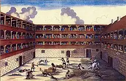 Am 16. Juni 1628 wurde das Fechthaus mit einer Komödie von Hans Mühlgraf[8] eröffnet, es gilt als das erste kommunale Theatergebäude auf dem Gebiet des Heiligen Römischen Reichs.[1] Die städtische Geistlichkeit kritisierte seit Eröffnung diese neue Institution und richtete mehrfach erfolglos Gesuche an den Rat, die Aufführungen einstellen zu lassen.[9] Im 17. Jahrhundert fanden die Fechtschulen (also Fechtwettbewerbe) montags und Komödienaufführungen mittwochs statt.[10] Um 1700 wurden die Fechtkämpfe vom Rat der Stadt jedoch verboten, sodass das Fechthaus für Schauspiele am häufigsten genutzt wurde. Die Nürnberger Fleischerzunft veranstaltete regelmäßig Tierhatzen, die letzte am 15. Februar 1759. Das Tierhetzen war vom Magistrat fortan ebenfalls untersagt.[11] Im Fechthaus wurden außerdem exotische Tiere wie Elefanten, Löwen oder Affen vorgeführt.[12] Anlagen speziell für Tierhatzen entstanden in der Barockzeit auch in anderen Städten, so beispielsweise der Hetzgarten in Berlin oder das Wiener Hetztheater.