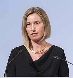 Am 2. August 2014 bestätigte der italienische Ministerpräsident Matteo Renzi formell die Kandidatur Italiens mit Federica Mogherini für das Amt der Hohen Vertreterin der EU für die Außen- und Sicherheitspolitik.[8] Am 30. August 2014 wurde bekannt gegeben, dass sie die Nachfolge von Catherine Ashton in diesem Amt antreten soll. Gleichzeitig leitete sie den Europäischen Auswärtigen Dienst und ist eine von sieben Vizepräsidenten der Europäischen Kommission. Am 22. Oktober 2014 wurde sie mit den anderen Mitgliedern der Kommission Juncker vom Europaparlament gewählt und trat ihr Amt am 1. November an.