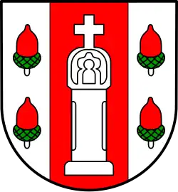 | Wappenbegründung: Die vier alten Stockgüter und die ausgedehnte Waldbesitzung von Feilsdorf werden durch die vier Eicheln symbolisiert. Das Wegekreuz in der Mitte steht für die zahlreichen Wegekreuze innerhalb des Gemeindegebietes.[14] |