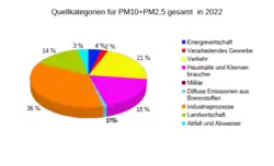 - ↑ Emission von Feinstaub der Partikelgröße PM2,5. Tabelle: Emissionen ausgewählter Luftschadstoffe nach Quellenkategorien. Umweltbundesamt, 27. März 2024, abgerufen am 29. Dezember 2024.