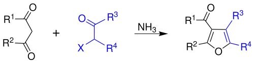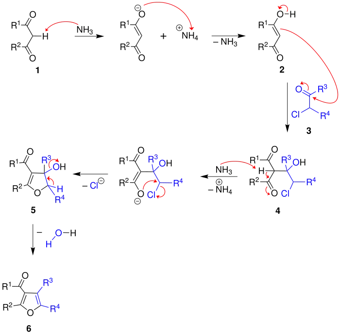 Zunächst wird die β-Dicarbonyl-Verbindung 1 unter Einwirkung einer Base – hier Ammoniak – deprotoniert. Es findet ein Protonentransfer statt, sodass sich das Enol 2 bildet. Dieses greift nun die Carbonylgruppe der α-Halogen-Carbonylverbindung 3 an. Es bildet sich die Carbonylverbindung 4. Über eine Zwischenstufe wird Chlorwasserstoff abgespalten und es bildet sich das Dihydrofuranol 5. Unter Wasserabspaltung entsteht aus 5 schließlich unter Aromatisierung das Furanderivat 6.[1]