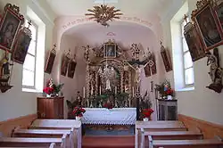 Der Innenraum wurde stark durchlichtet und mit einer flachen Tonnenwölbung über Profilgesims ausgeführt. Zudem verfügt der Innenraum über einen geschweiften, von Stuckrahmen eingefassten Spiegel. Der barocke Altar stammt aus der ersten Hälfte des 18. Jahrhunderts, wurde aus Holz gefertigt und besitzt neben einer blau-grünen Marmorfassung auch vergoldete Ornamentteile. Der Aufbau des Altars ist von gedrehten, von Weinranken umrankten Doppelsäulen geprägt, die ein vorschwingendes Gebälk und einen reich geschmückten Volutenauszug mit Festons und Girlanden tragen. Zwischen den Doppelsäulen befinden sich zudem zwei spätgotische Figuren aus der Zeit um 1515, die links den heiligen Rupert und rechts den heiligen Virgil darstellen, während das Altarbild in Öl auf Leinwand Alle Heiligen vor der Dreifaltigkeit zeigt. Die Heiligenfiguren stammen dabei möglicherweise aus der ehemaligen Pfarrkirche in Matrei. Flankiert wird der Altar zudem von Figuren des heiligen Chrysanth und des heiligen Florian, während über dem Auszug der Erzengel Michael und eine Schutzengelgruppe thronen. Weitere Inneneinrichtungen sind das hölzerne Gestühl mit geschwungenen Wangen, spätbarocke Kreuzwegbilder aus dem Jahr 1796 von Johann Renzler sowie weitere Bilder und ein Vortragskreuz.