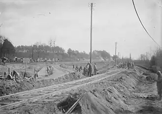 ![]() der Feldbahn bei Breuil-sur-Vesle, Januar 1917 ![]() Einschnitt der Feldbahn im Wald von Prouilly Bau des Normalspur-Abstellgleises und im Hintergrund der Feldbahn bei Breuil-sur-Vesle, Januar 1917 ![]() Einschnitt der Feldbahn im Wald von Prouilly | |||||||||||||