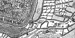 Ausschnitt aus dem Duisburger Stadtplan von Johannes Corputius mit Feldbrandziegelei in der Rheinaue, 1566