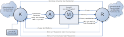 Der Kommunikator (K) produziert eine Aussage (A) durch Stoffauswahl und Gestaltung, abhängig von bzw. mitbestimmt durch seine intra-/interpersonellen Faktoren (sein Bild von sich selbst, seine Persönlichkeit, seine Position innerhalb eines etwaigen Teams, seine Position innerhalb einer etwaigen Institution, seine Situation innerhalb sozialer Beziehungen und unter einem Zwang der Öffentlichkeit.)