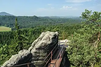 Die Felsenburg liegt am Südrand eines ausgedehnten Wald- und Felsgebietes, welches den Kern der Böhmischen Schweiz bildet. Die Aussicht umfasst im Wesentlichen den Blick von Osten über Süden bis nach Westen. Markante Berge im Blickfeld sind der Kaltenberg, die Lausche, der Rosenberg, der Hohe Schneeberg und der Kamm des Erzgebirges.