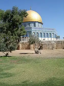 In der Nähe des Felsendoms – ebenfalls auf dem Tempelberg – befindet sich die al-Aqsa-Moschee, die ebenfalls unter den Umayyaden errichtet wurde. Die irrtümlich verwendete Bezeichnung „Umar-Moschee“ geht auf Überlieferungen zurück, deren Authentizität fraglich ist. Danach soll der zweite Kalif ʿUmar ibn al-Chattāb nach der muslimischen Eroberung Jerusalems am Palmsonntag, dem 2. April 635, auf dem Tempelberg (oder am Mihrab Davids, heute als der Turm Davids am Jaffator bekannt) gebetet haben.[6] Weiteren Berichten zufolge, deren Authentizität ebenfalls fraglich ist, sollen der Kalif und der christliche Patriarch Sophronius von Jerusalem († gegen 638) den Tempelberg gemeinsam von Abfall und Trümmerschutt befreit haben.[7]