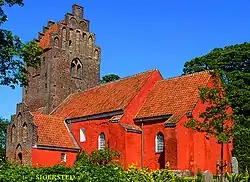 Auf einem vom Backsteinmauerwerk umgebenen Stein an der Basis der Westseite des Kirchturms steht, neben anderen meist kleineren schmucklosen Steinen, ein 1,4 m hoher, 1,3 m breiter Stein aus rötlichem Granit in den ein Radkreuz (dänisch Hjulkors) und mehrere Schälchen (dänisch Skåltegn) eingraviert sind.