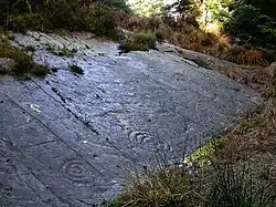 Die Ritzungen konzentrieren sich überwiegend an einer Seite des Aufschlusses. Sie bestehen hauptsächlich aus Cup-and-Ring-Markierungen, von denen etliche durch eine stets in dieselbe Richtung weisende Rinne unterbrochen sind.