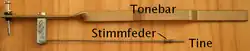 Bei dem Rhodes wird der Klang durch eine sogenannte „asymmetrische Stimmgabel“ erzeugt. Diese besteht aus einem ca. 1 mm dünnen, runden Stimmstab (engl.: „Tine“), der von einem durch die Taste ausgelösten Gummihammer zum Schwingen gebracht wird. Dieser Stab ist durch einen Metallblock fest mit dem Tonriegel (engl.: „Tonebar“), einem Resonator, der einer Platte eines Vibraphons ähnelt, verbunden. So werden durch den Druck einer Taste beide Seiten der Stimmgabel in Schwingung gebracht. Es entstehen sowohl tieffrequente Töne durch den Stimmstab als auch hochfrequente Obertöne, die aber aufgrund der Inharmonizität sehr weit gespreizt sind, da im Gegensatz zu einer Saite die Saitenspannung fehlt – der Stimmstab kann als einseitig eingespannte Saite angesehen werden. Der erste Oberton hat die 7-fache Frequenz des Grundtones, der zweite Oberton die 21-fache. Weitere Obertöne des Ausgangssignals entstehen durch den magnetischen Tonabnehmer. Dabei spielt die relative Höhenlage zwischen der Stimmstabspitze und der Spitze des magnetischen Tonabnehmers eine Rolle. Mittige Lage erhöht den Anteil der Obertöne, außermittige Lage hebt den Grundton an.[3]
