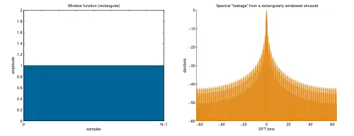 Die einfache Verarbeitung des Eingangssignals in Blöcken entspricht der Anwendung dieser Fensterfunktion. Das Betragsspektrum entspricht dem Betragsverlauf der si-Funktion. Nur im Sonderfall, wenn die Fensterbreite exakt ein ganzzahliges Vielfaches der Periodendauer der harmonischen Signalschwingung umfasst, tritt bei zeitdiskreten Signalen zufolge der Fensterung mit dem Rechteck-Fenster kein Leck-Effekt auf.