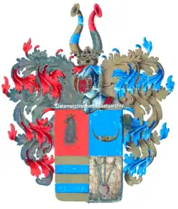 - Blasonierung des Wappens von 1776: Geviert. Feld 1 in Rot ein gekrönter silberner Adlersrumpf; Feld 2 in Blau ein gesichteter goldener Mond, die Hörner aufwärts; Feld 3 in Gold zwei blaue Balken und Feld 4 in Silber ein rotes Herz, in welchem drei Degen mit goldenen Griffen stecken. Auf dem Helm mit rechts rot-silbernen und links blau-goldenen Decken zwei Büffelhörner, rechts golden mit zwei blauen Binden, links von rot und silbern geteilt.