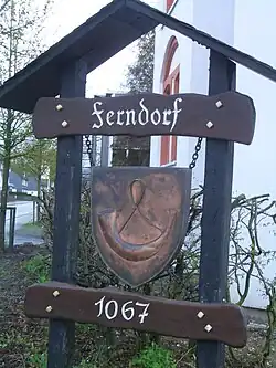 Wappen von Ferndorf am Ortseingang, Farbgebung: Blau auf Orange