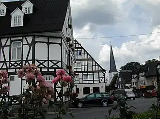 Im Ortskern von Ferndorf (von links: ehemaliges Hotel Finke, Gasthaus Em Backes, Laurentiuskirche, Sparkassenfiliale, Bäckerei)
