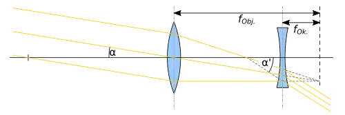 Das Objektiv erzeugt in der Fokalebene ein auf dem Kopf stehendes und seitenverkehrtes (also insgesamt um 180° gedrehtes) reelles Bild des betrachteten Gegenstands, dort kann auch ein Mikrometer oder Fadenkreuz angebracht werden. Dieses Zwischenbild wird mittels des Okulars wie mit einer Lupe vergrößert betrachtet.