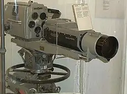 Ab dem 22. März 1935 wurde in Deutschland durch den Fernsehsender Paul Nipkow das erste regelmäßige Fernsehprogramm der Welt ausgestrahlt. Ihren Höhepunkt erlebten die Sendungen, welche bis 1937 in 180 Zeilen gesendet wurden, mit den umfangreichen Übertragungen von den Olympischen Sommerspielen 1936 in sogenannte Fernsehstuben und Großbildstellen in Berlin und später Hamburg. Hierfür wurde auch erstmals ein aus 15 Fahrzeugen bestehender mobiler Fernsehsender in Dienst gestellt. Für die Darstellung der Fernsehbilder in Leinwandgröße in den Großbildstellen wurde das Zwischenfilmverfahren verwendet. Weitere funktionsfähige Fernsehgroßbildverfahren in dieser Zeit waren: 1) die Zellenrastermethode (eine Zellenrastertafel mit 10.000 bis 40.000 Glühlampen als Bildpunkte; entwickelt von A. Karolus) sowie 2) Projektionsgeräte mit Schmidtschem Spiegelobjektiv (mit Braunscher Röhre).[28][29] Das später sehr bekannte Eidophor-Großbildprojektionsgerät mit einem neuartigen Funktionsprinzip wurde 1939 erst theoretisch konzipiert. Nach langwierigen Prototypenphasen wurde es ab 1959 seriell produziert.[30]