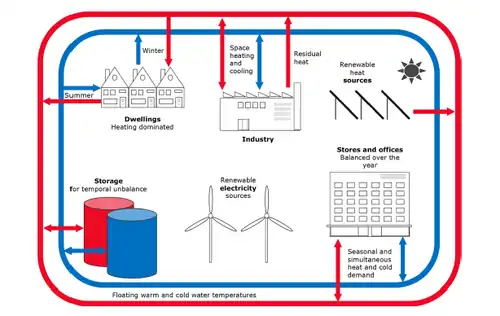 Als Wärmequelle sollen erneuerbare Energien oder Abwärme aus Industrieprozessen dienen, neben (biomassebefeuerten) KWK-Anlagen sollen unter anderem Großwärmepumpen eine wichtige Rolle einnehmen, womit sich eine starke Kopplung mit dem Elektrizitätssektor ergibt. Durch die Kombination von Strom und Wärme liefernden KWK-Anlagen, Wärmepumpen und Wärmespeicher sollen Fernwärmesysteme der 4. Generation zudem viel Flexibilität für Energiesysteme mit hohem Anteil variabler erneuerbarer Energien wie Windenergie und Solarenergie bieten und somit deren schwankende Energielieferung ausgleichen; beispielsweise durch Betrieb der Wärmepumpen bei Ökostromüberschuss oder alternativ der KWK-Anlagen bei nicht bedarfsdeckender Ökostromproduktion.[2] Diese Flexibilität des Wärmesektors kann in sektorgekoppelten Energiesystemen eine Schlüsselrolle bei der Integration fluktuierender erneuerbarer Energiequellen spielen.[5] Fernwärmesysteme der 4. Generation gelten zugleich als Schlüsseltechnologie für den Einsatz von Fernwärmesystemen in Gebäuden, die aufgrund guter Wärmedämmung nur einen geringen Heizbedarf aufweisen.[29] In Dänemark ist die Umstellung von dritter auf vierte Generation bereits in Gang (Stand 2018).[30]